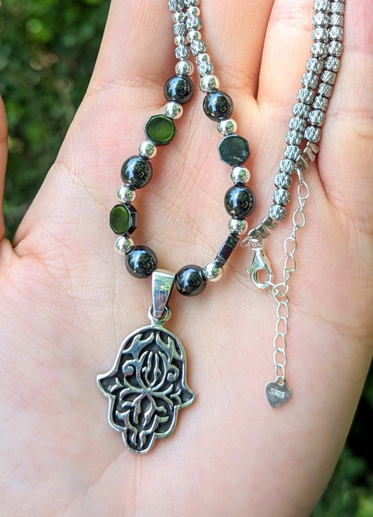 Hamsa, Opal, Green Tourmaline Pendant with Zirconia and Raw Gemstones