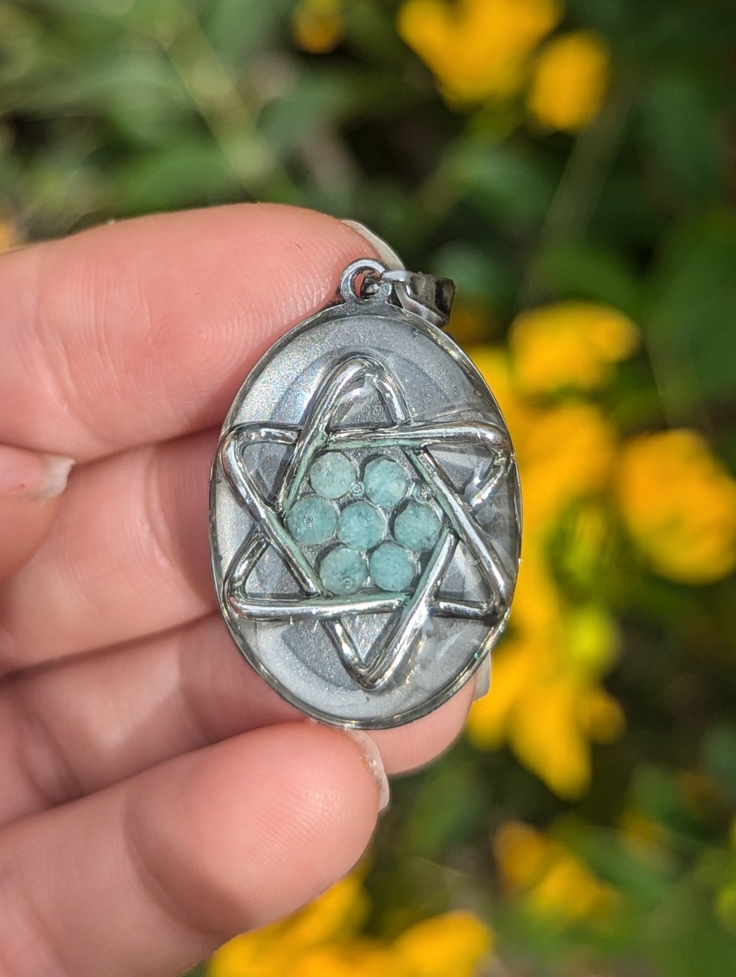 Welcome to Israel! And this is the Amazonite Gemstones Silver Magen David Resin Pendant
