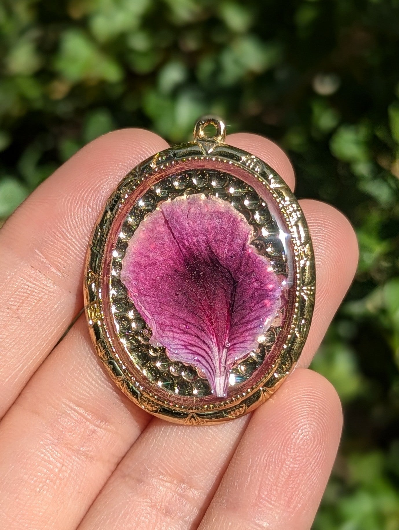 Anna: Pink Purple Israeli Flower Leaf in Oval Decorated Gold Plated Resin Pendant
