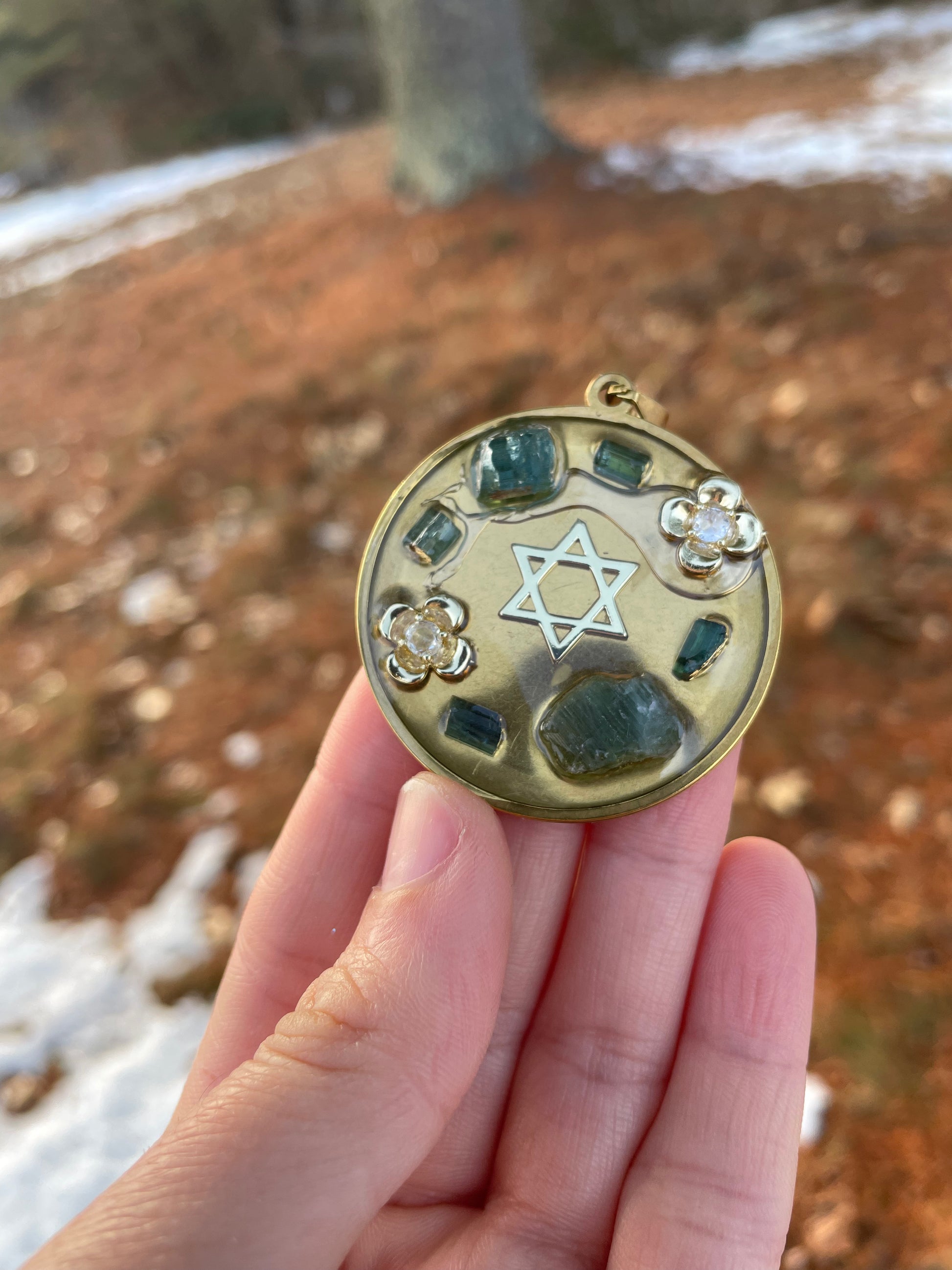 Blue Tourmaline Flowers Magen David Large Round Gold plated Pendant
