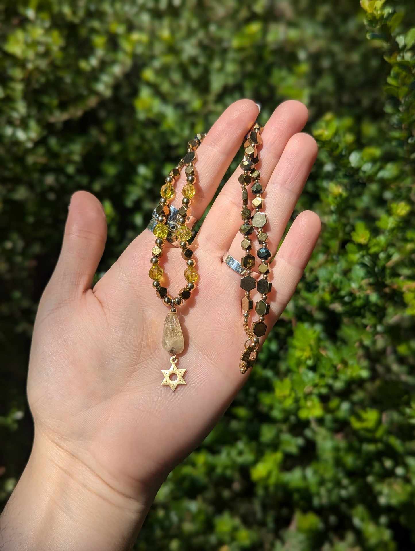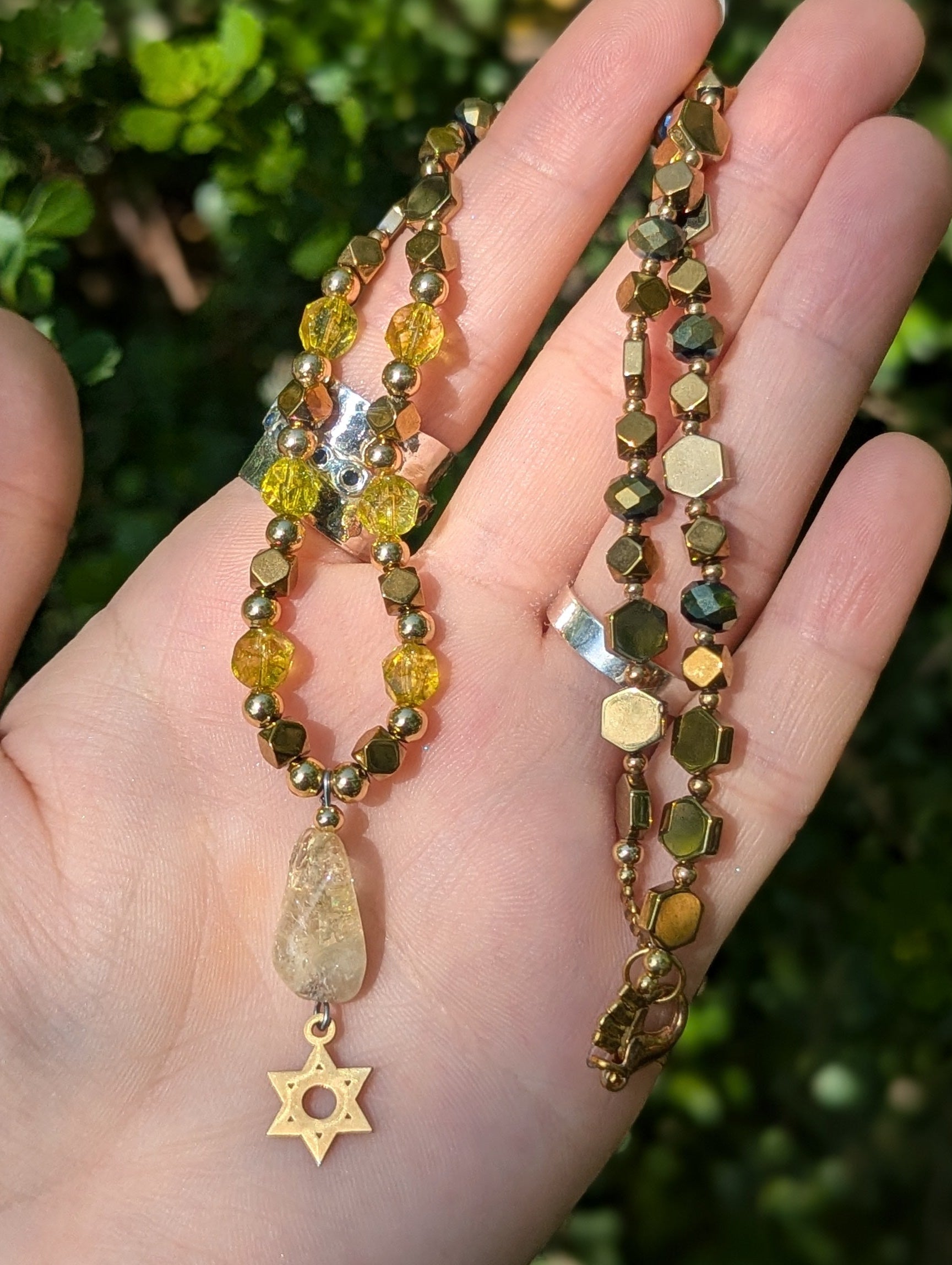 Welcome to Israel! And this is the Citrine Gemstone and Gold Plated Magen David, Green Yellow Beads and Golden Geometric Beaded Necklace.