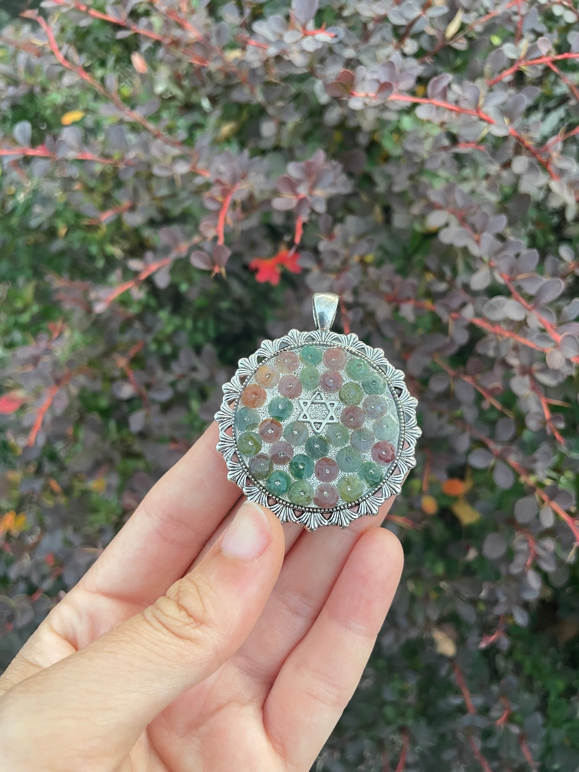 Indian Agate Green and Red Gemstones Silver Magen David Round Pendant