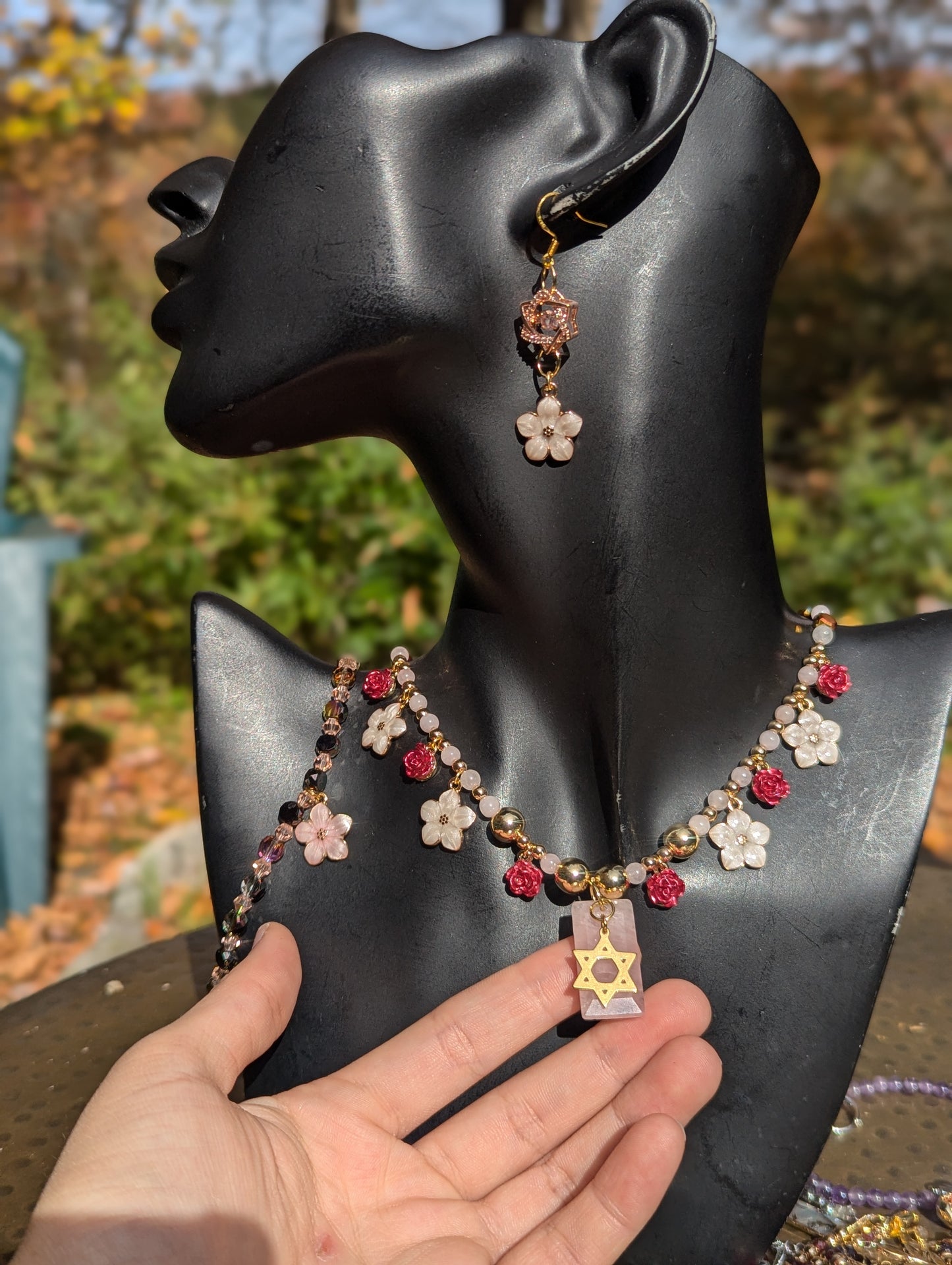 Necklace: Rose quartz rectengular pink gemstone endant with golden Magen David pendant, roses and tropical flowers pink pendants, golden beads and pink rose quartz gemstones beaded necklace.