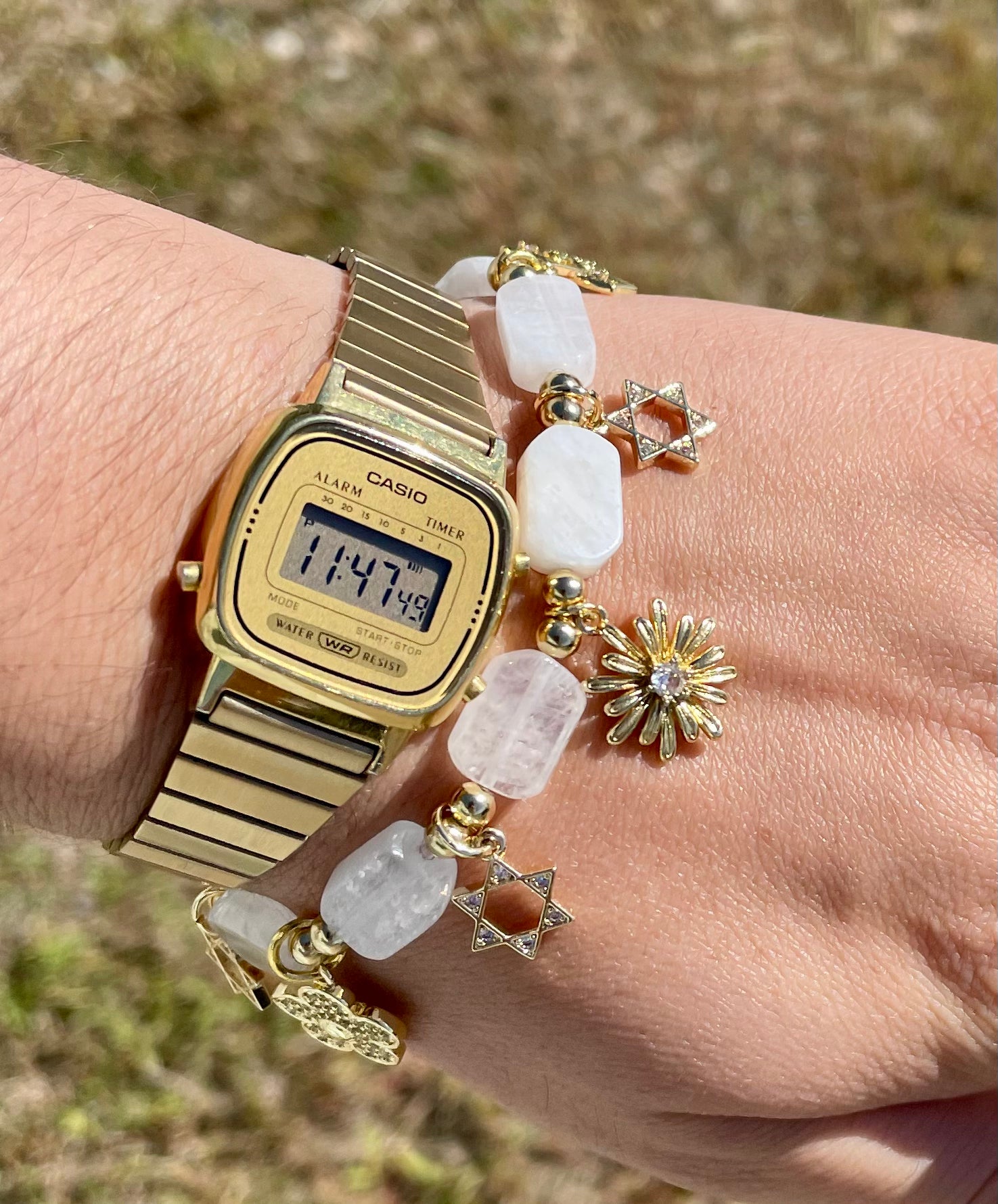 Moonstone Gemstones Gold Plated Magen David Stars and Flowers Adjustable Beaded Bracelet