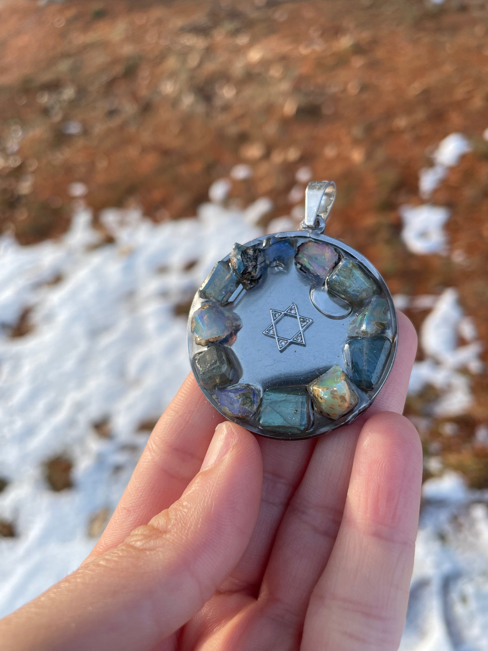 Opal and Labradorite Gemstones Round Silver Stainless Steel Magen David Pendant
