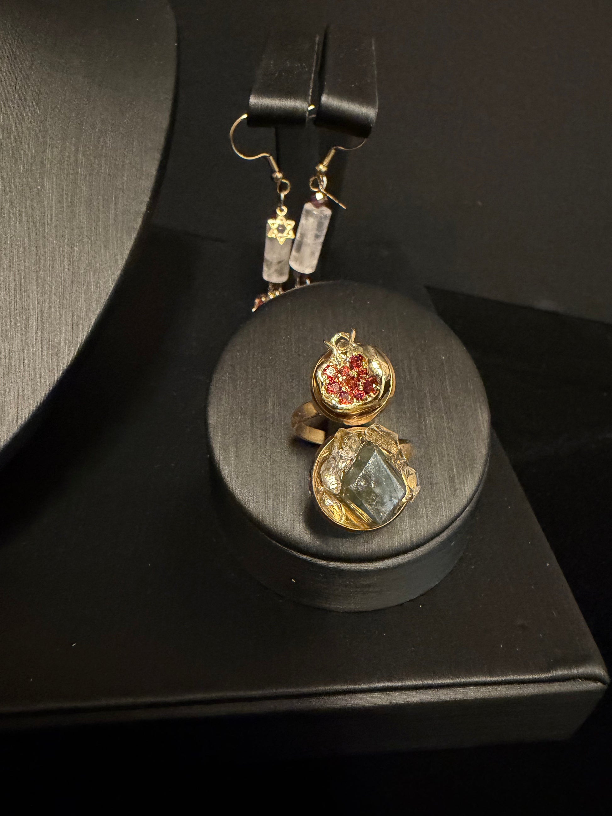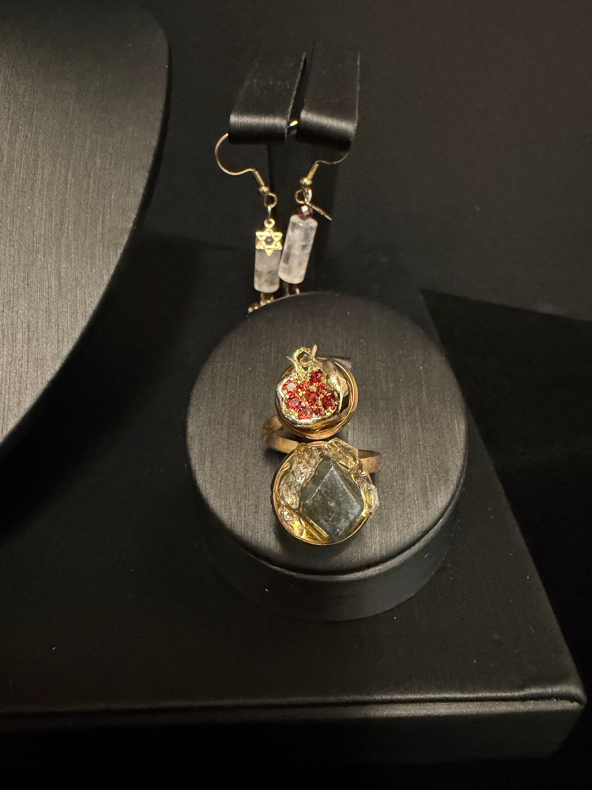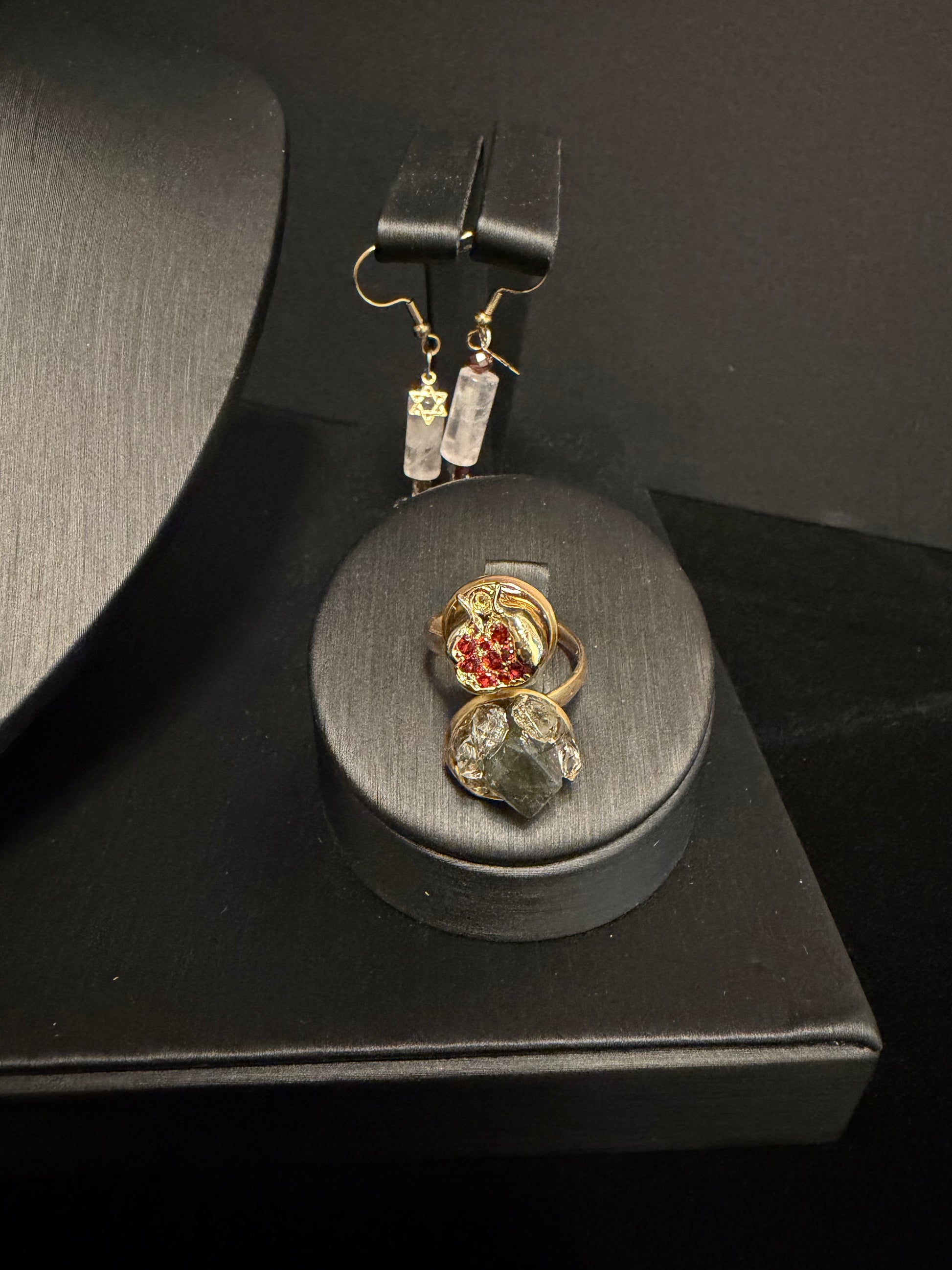 Pomegranate Labradorite Quartz Adjustable Ring. Handmade with a pomegranate charm, red zirconia, Labradorite and Quartz gemstones, in adjustable stainless steel.