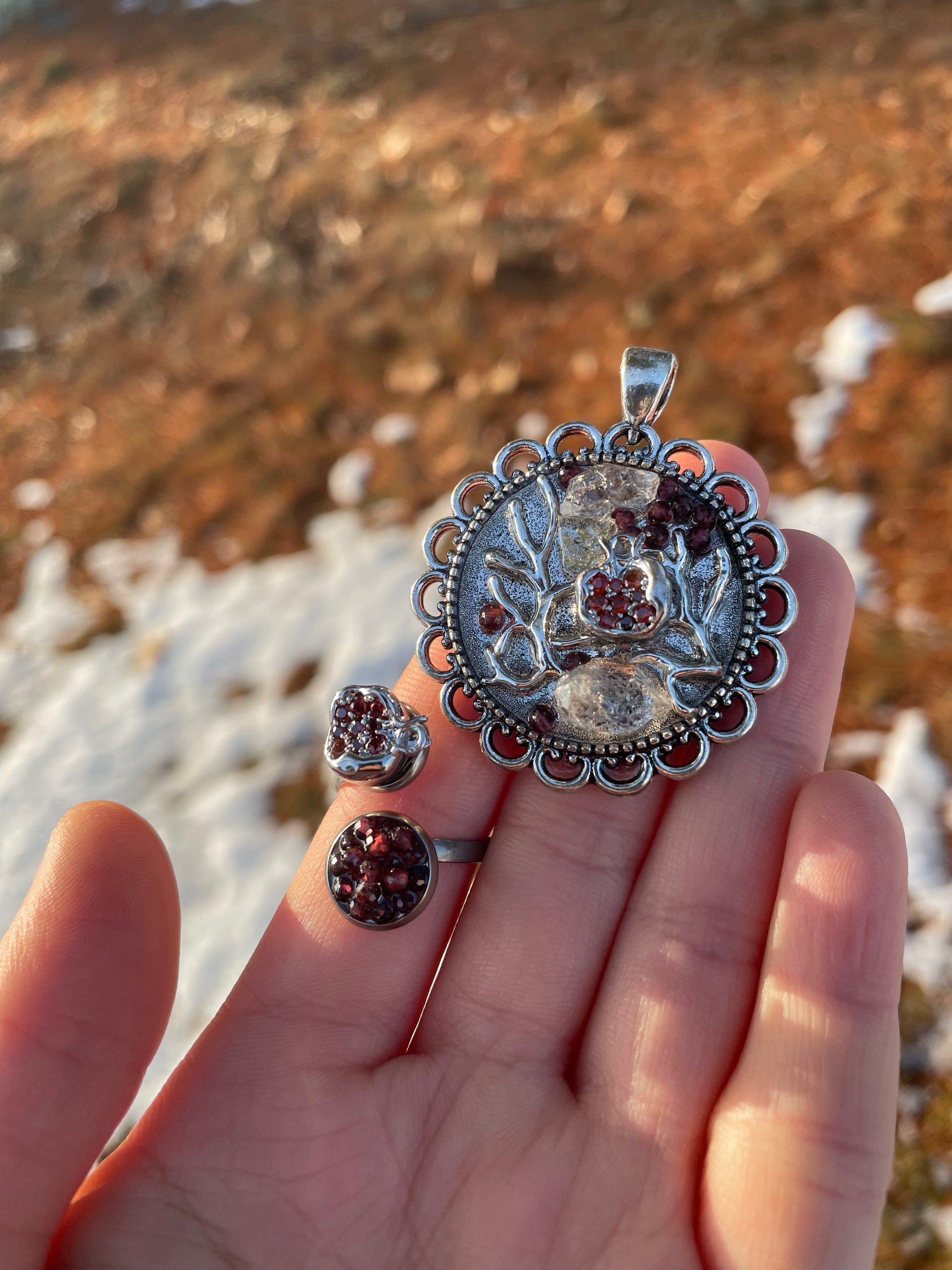 Silver Pomegranate Leafy Garnet and Quartz Gemstones Resin Pendant