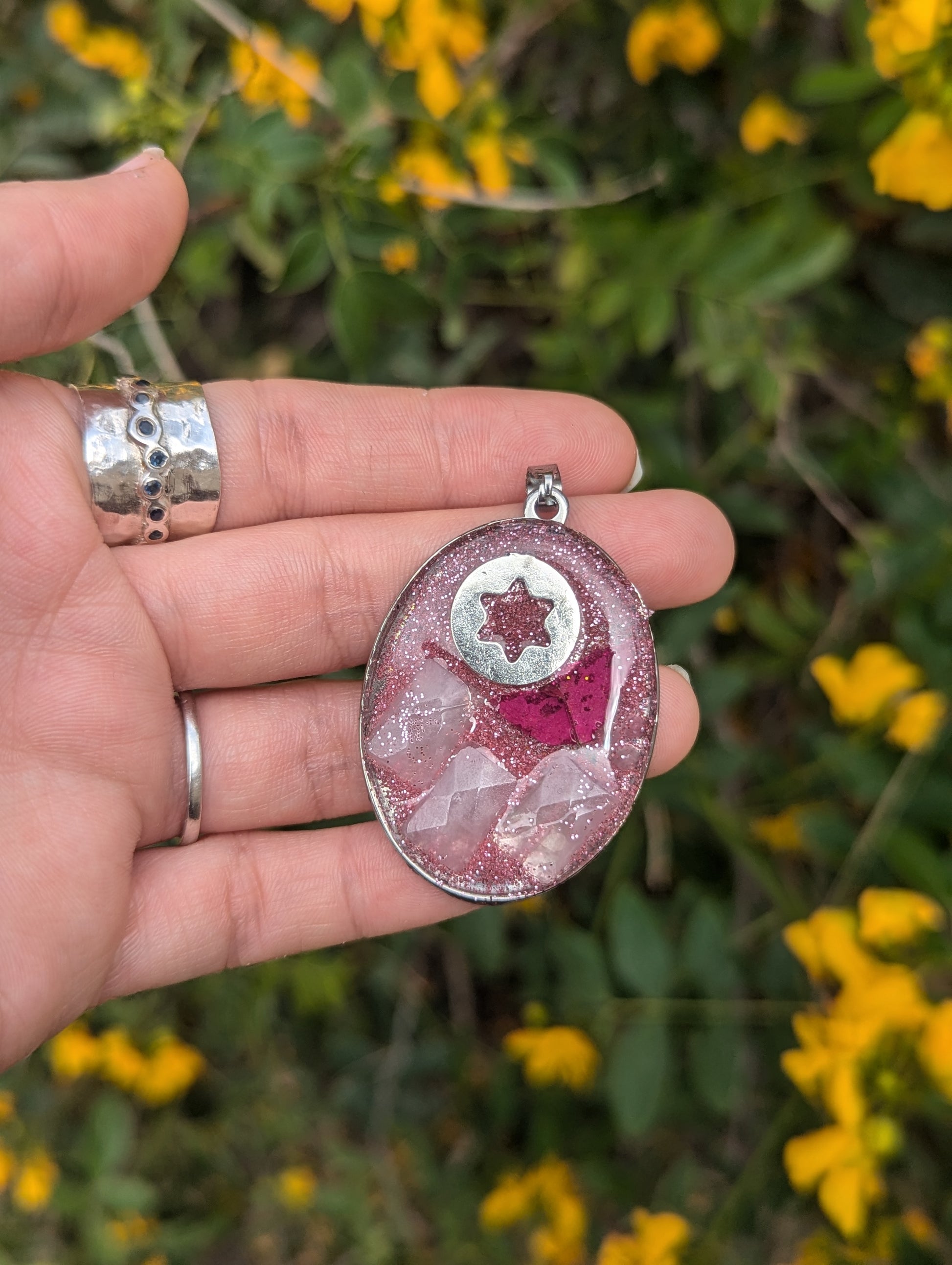 Welcome to Israel! And this is the Silver Round Magen David, Israeli Pink Flower Leaf, Rose Quartz Gemstones and Pink Glitter Resin Pendant