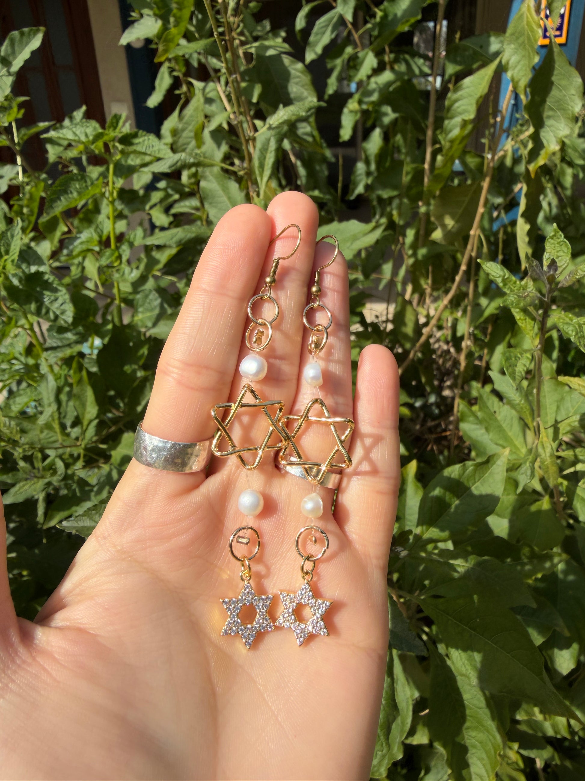 White Pearls Double Magen David Zirconia String Style Gold Plated Earrings with stainless steel hooks.